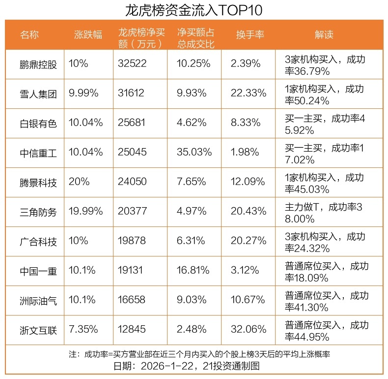 1月22日,上证指数上涨0.14%,深证成指上涨0.5%专业提供股票配资,创业板指上涨1.01%。盘后龙虎榜数据显示,共有51只个股因当日异动登上龙虎榜,资金净流入最多的是鹏鼎控股(002938.SZ),达3.25亿元。