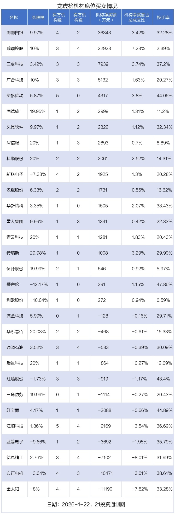 其中,机构净买入金额最多的是湖南白银(002716.SZ),当日收盘上涨9.97%,换手率为32.28%。