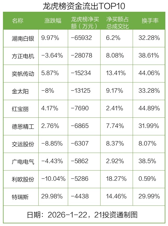 而龙虎榜中资金净流出最多的是湖南白银(002716.SZ),被净卖出为6.59亿元,占总成交金额的6.2%。湖南白银收盘上涨9.97%,换手率为32.28%。